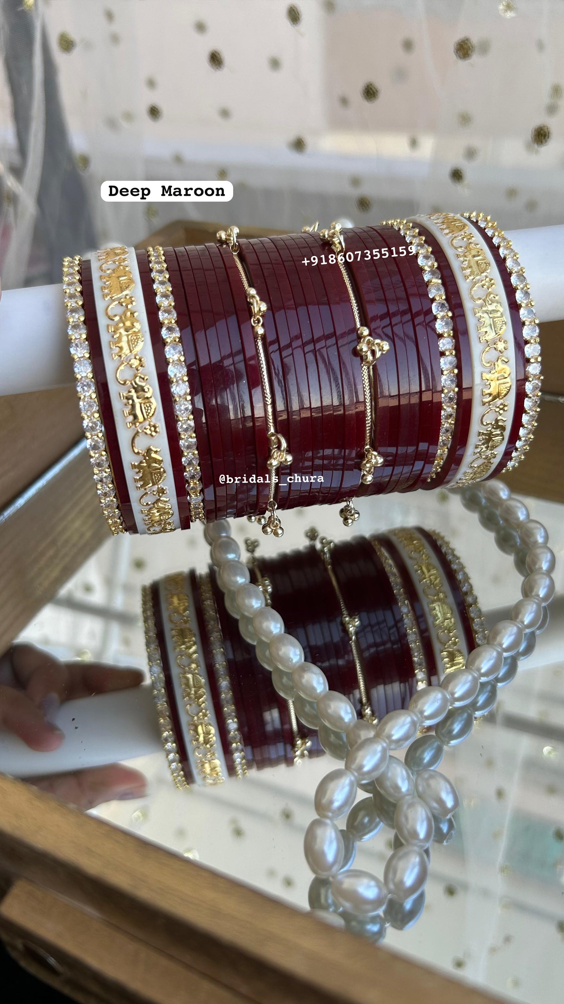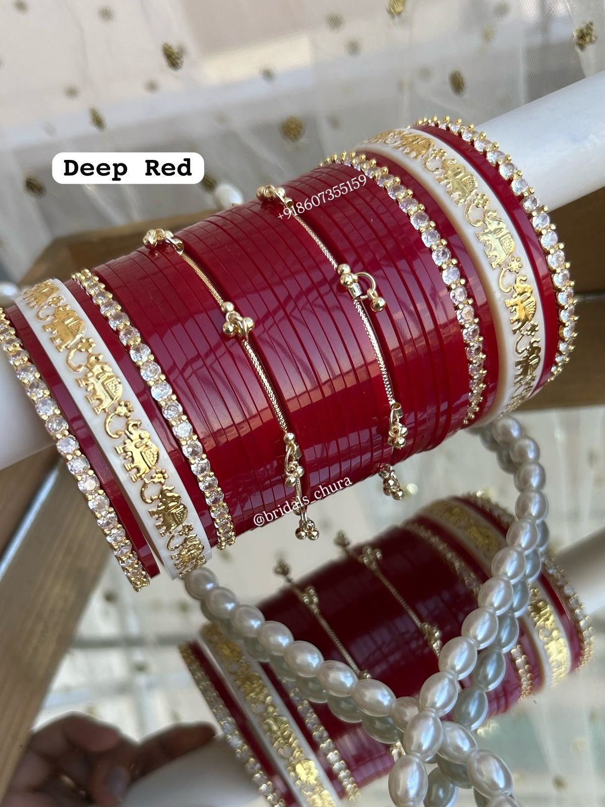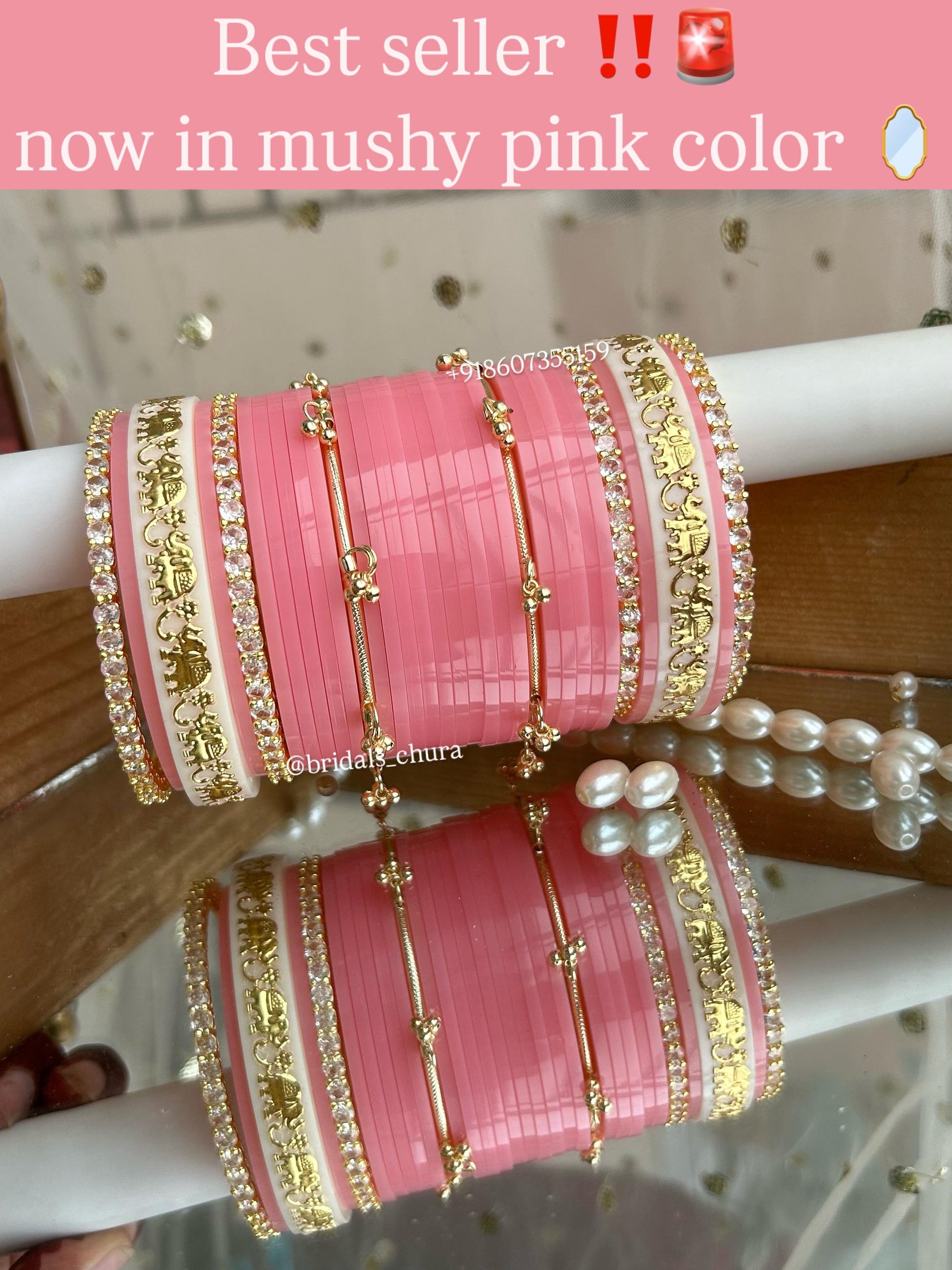As an expert in the industry, our Elephant Ghunguru Chooda features elegant elephant motif brass bangles with AD zircon, providing a stunning shine. This viral set on Instagram comes in a pair for both hands, with smooth and non-allergenic material for gentle skin. Sizing is based on size increase towards the arm, ensuring a perfect fit. Contact us via WhatsApp for color customization or international payment link.