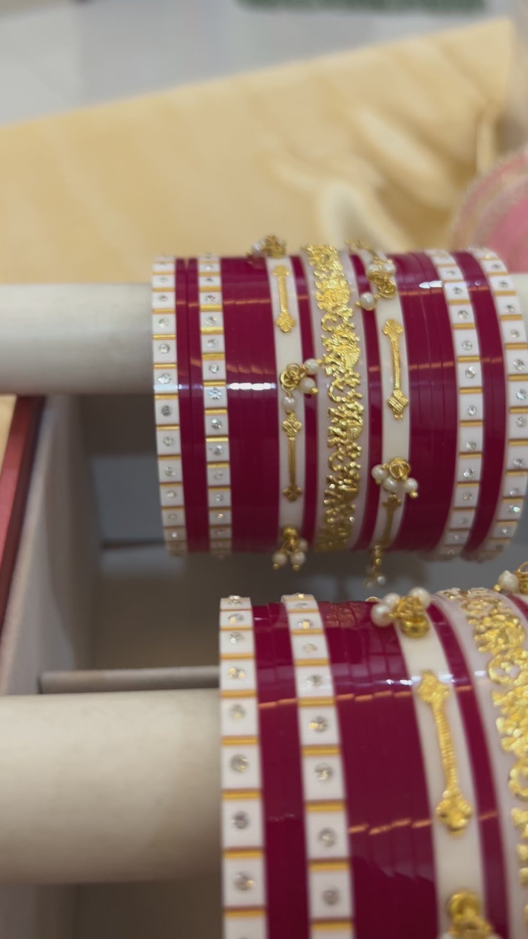 The ‘Geet’ Rani pink short chooda is designed for daily wear post-wedding. Crafted from pure seep material, this chura is comfortable and skin-friendly, eliminating metal for enhanced wearability. Each set encompasses both hands, ensuring a cohesive aesthetic. Ideal for those seeking practical elegance.