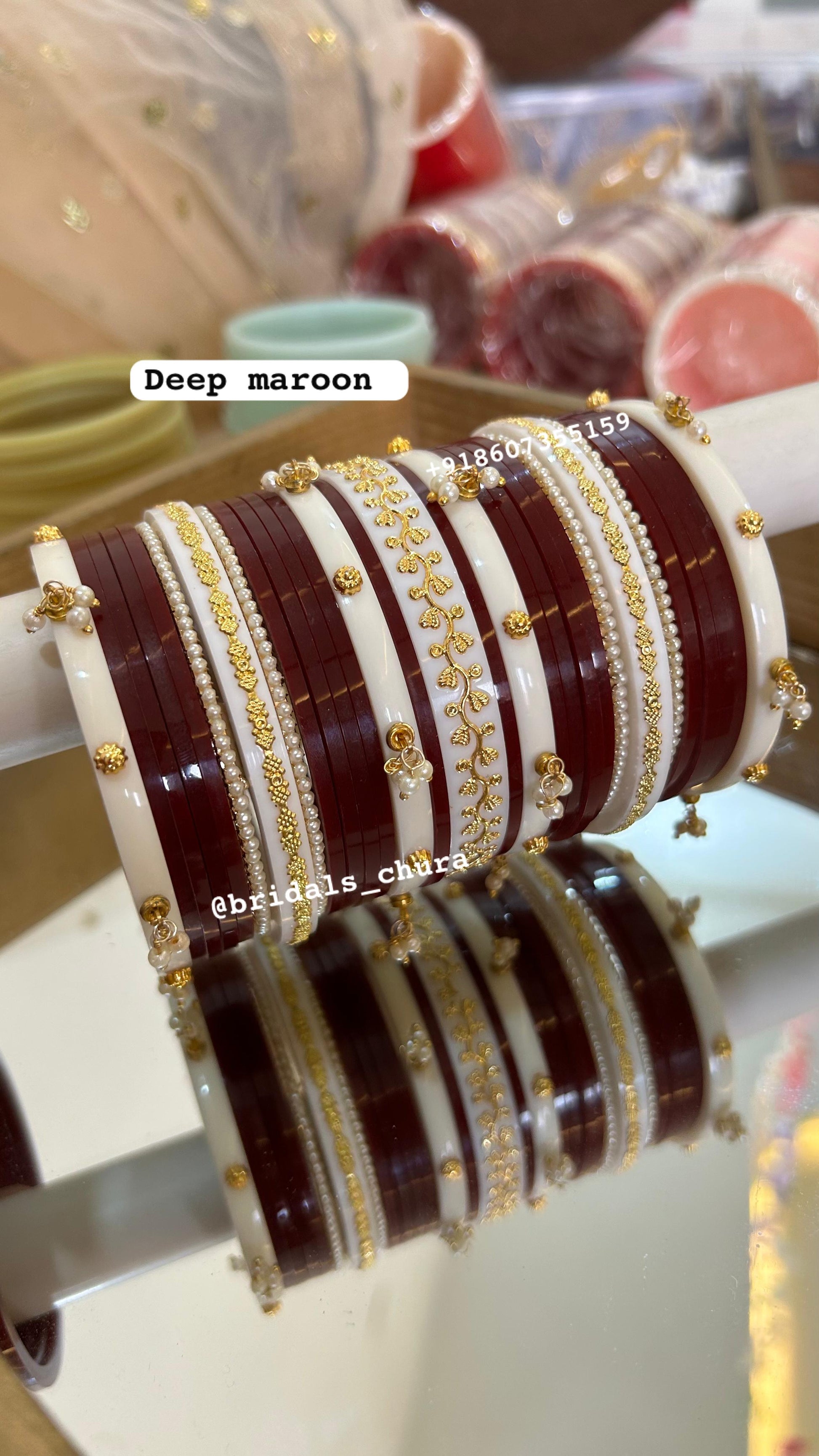 This 'khilkhili' chura cum bangles set is a perfect choice for any occasion, whether you're getting married or not. Made with premium quality materials, these bangles are crafted with care and are skin-friendly. Each set comes in a pair for both hands and features a beautiful blue and maroon color combination. No sharp edges or irritation, just smooth and stylish bangles.