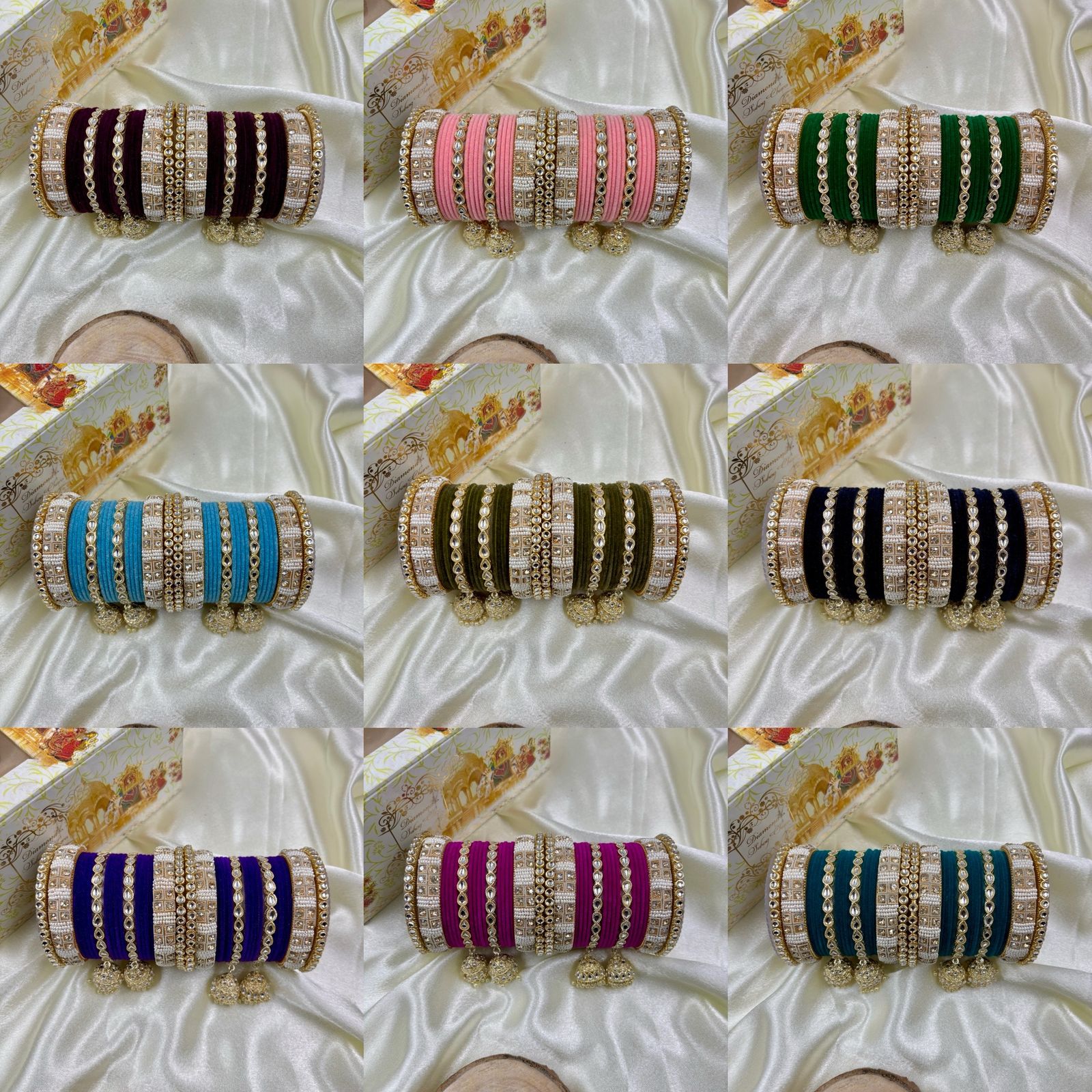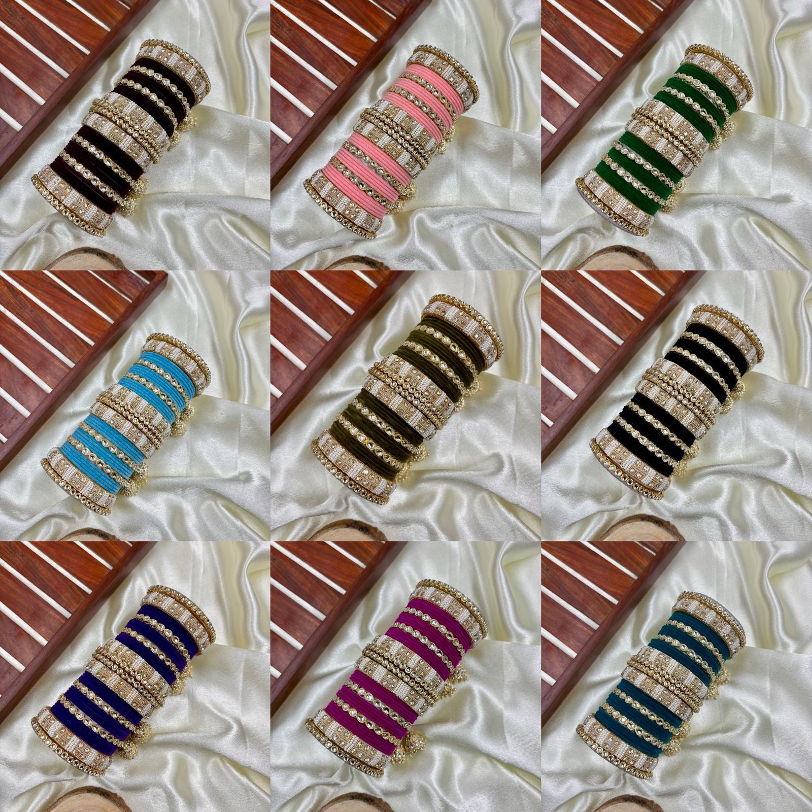 These colorful wedding bangles are the perfect addition to any party outfit. The set includes stunning jhumki hangings that add a touch of elegance and charm. Add a pop of color and style to your next event with these eye-catching bangles.