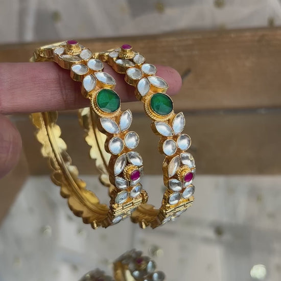 The 'Mannat' Kundan Bangles are crafted from brass and feature high-quality Kundan, ensuring a luxurious feel. Designed with ruby and green stone accents, they provide an elegant appearance. The anti-tarnish, high gold plating enhances durability, making them suitable for formal occasions while maintaining comfort against the skin.