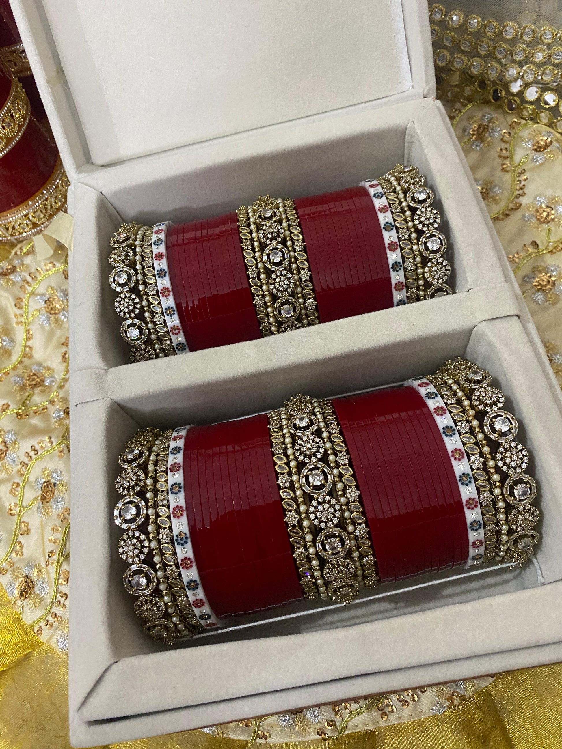 Enhance your bridal look with our Mehndi polish AD bridal chooda. The intricate design with American diamond stones adds a touch of elegance to your wedding ensemble. A must-have for any bride, this chooda will surely make you stand out on your special day.