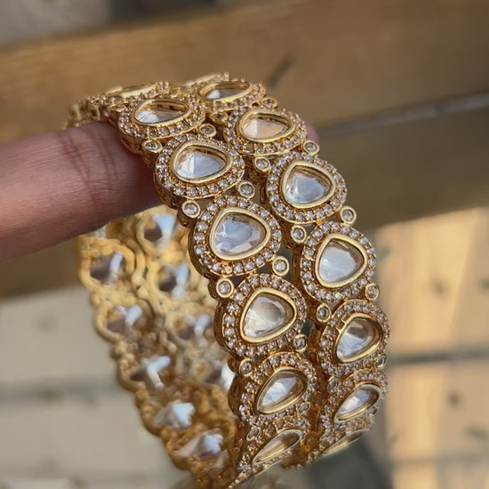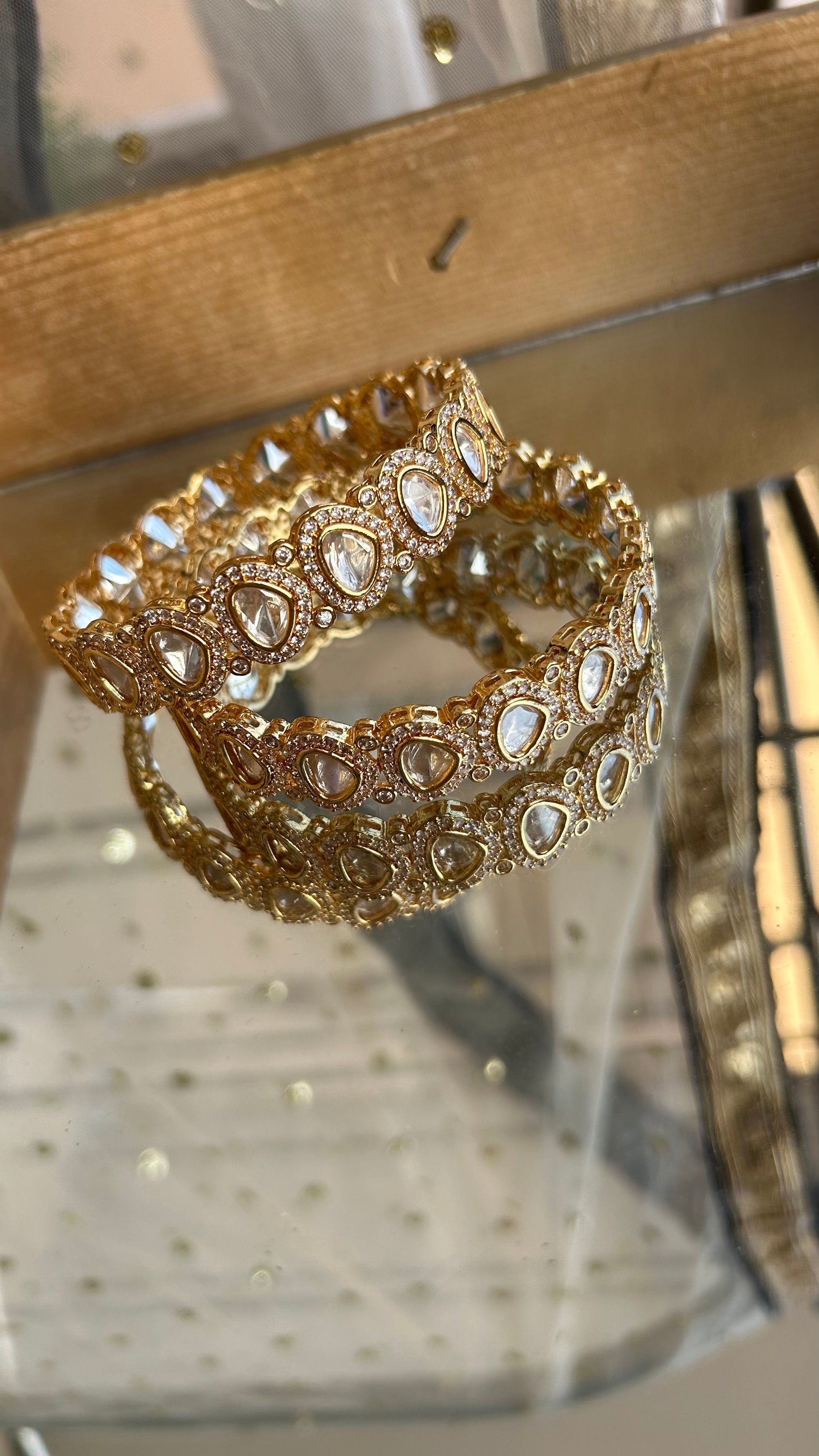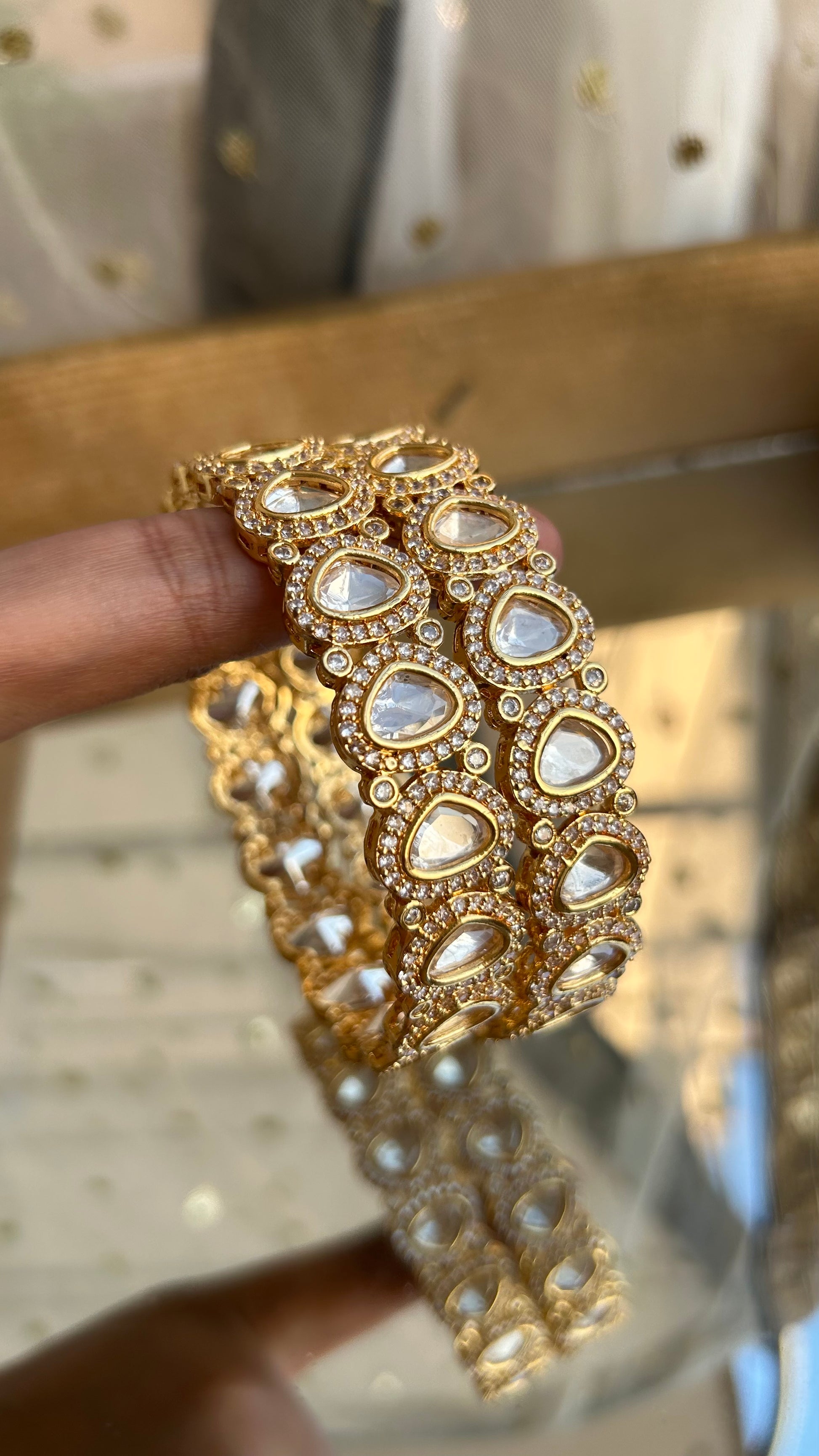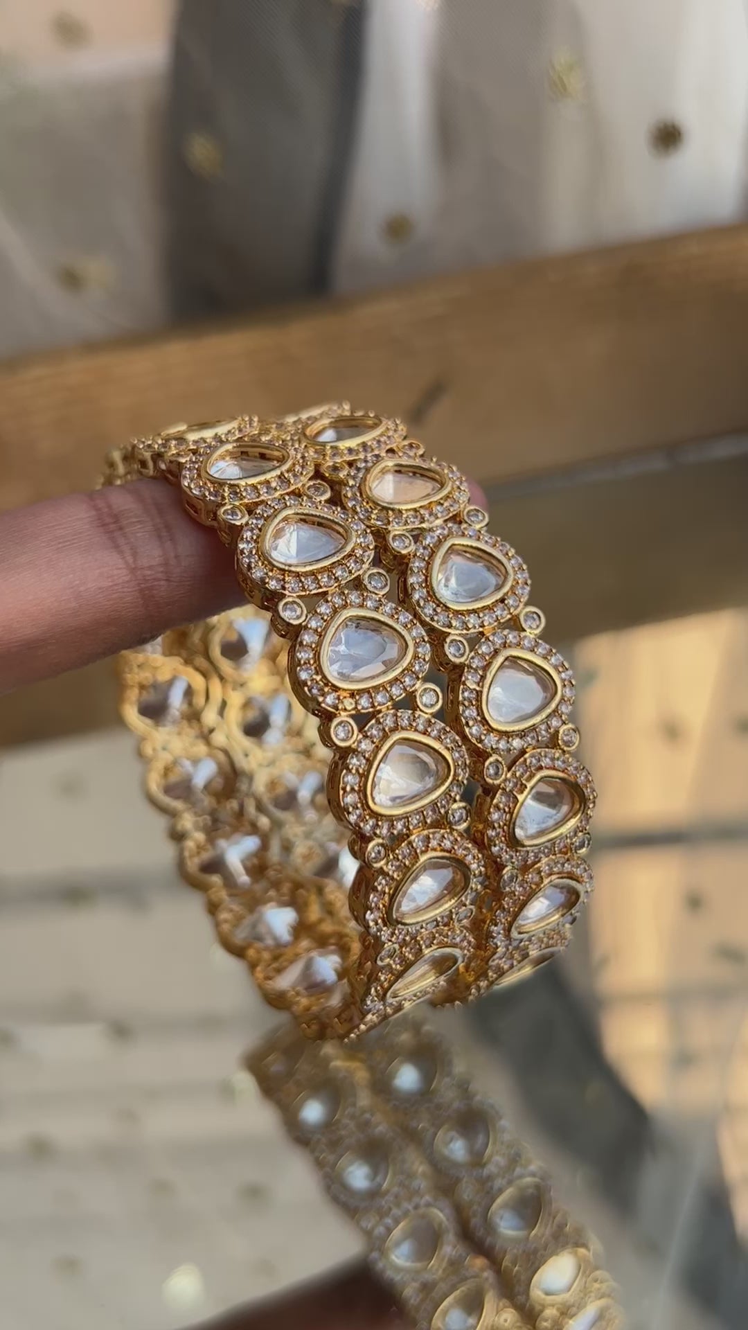 The 'Alexa' Uncut Polki kadda features a light gold to rose gold hue, crafted from brass, making it suitable for sensitive skin types. Its elegant design offers a sophisticated aesthetic, ideal for enhancing formal attire. The non-energetic material ensures comfort during extended wear.